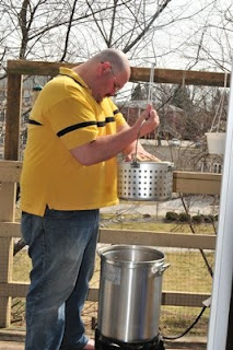While I was setting up the mash, I heated up the honey for my second batch of mead. While I was heating up the mash to mash out temp, I racked my first batch of mead over to secondary and put 4 gallons of water and 4 quarts of honey on top of the leftover yeast. Hopefully this will be a nice low cost, low maintenance method for making a second batch. My gravity on this batch is pretty low, 1.070, so will be adding fruit to this at some point to help boost it up.